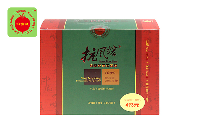 “抗風(fēng)竤”選自世界尖端純雌性紅蘿卜品種——“9801-79A”,具有極高的細(xì)胞密度和極為豐富的活性酶,單位體積的營(yíng)養(yǎng)含量超過(guò)其它品種幾十倍,這是普通蘿卜所無(wú)法比擬的??癸L(fēng)竤 · 東北雌性紅蘿卜及纓子濃縮原粉獲國(guó)家發(fā)明專利(專利號(hào):ZL2009 1 248652.6),抗風(fēng)紅·東北雌性紅蘿卜及纓子中維生素K的含量遠(yuǎn)高于其他食物,維生素K具有溶解痛風(fēng)石的作用。