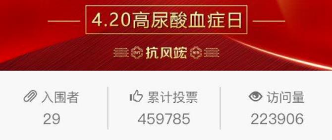 全國十大“抗風(fēng)斗士”評選投票通道從4月20日開通以來,在全國各地引起了廣大醫(yī)生、風(fēng)友、風(fēng)友家屬的廣泛參與,掀起了投票熱潮。截止到4月26日晚17時,累計投票已近四十六萬票,投票平臺累計訪問人次超過二十二萬。