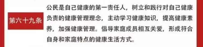 值得一提的是“倡導(dǎo)健康生活方式、倡導(dǎo)健康飲食習(xí)慣、加強健康管理……”等內(nèi)容被寫入法律。《健康法》第六十九條:公民是自己健康的第一責(zé)任人,樹立和踐行對自己健康負(fù)責(zé)的健康管理理念,主動學(xué)習(xí)健康知識,提高健康素養(yǎng),加強健康管理。倡導(dǎo)家庭成員相互關(guān)愛,形成符合自身和家庭特點的健康生活方式。